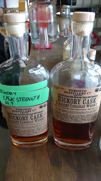 Jesse and Chuck invited us back to the Toronto Distillery Co. before they shut down January 31st to try their recent Hickory cask release at bottled and cask strength. Only a few of us from TWS were able to make it, but it was a fantastic afternoon. The Hickory Cask release is 100% toasted soft winter wheat grain, aged in a hickory wood cask (with 1 oak stave, the darker stave on the side view you can see in the pics) for 3 years. The cask is 77L capacity and looks like a torpedo rather than a typical oak cask. The whisky was casked at 62.5% and lost only a few % points as it was 60.9% coming out of the cask. There was a lot of evaporation though, and they only got 54 bottles out of it after 3 years.