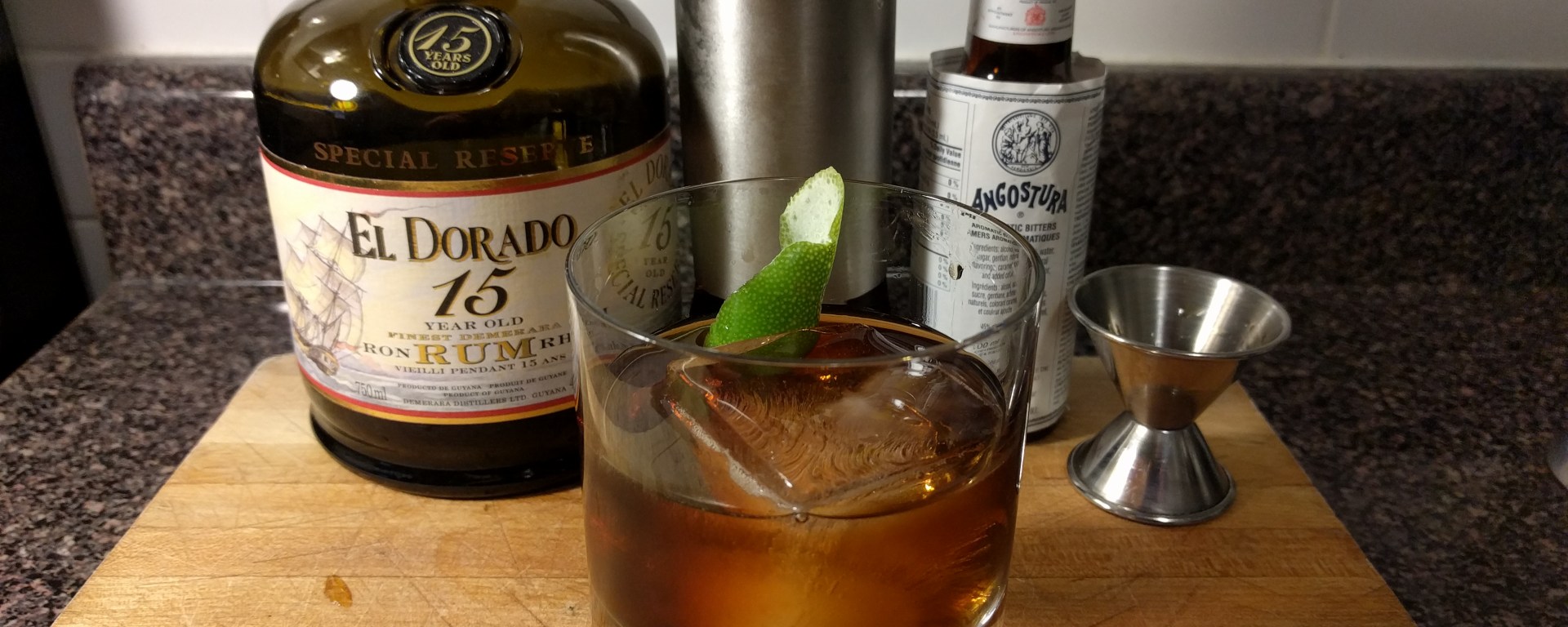 • Ingredients: 2oz El Dorado 15 Rum, 0.5oz brown sugar simple syrup, 3-5 dashes of Angostura bitters.