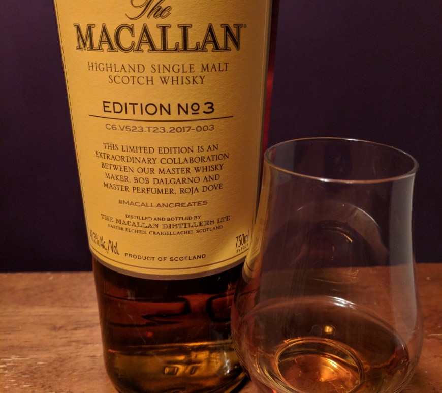 Macallan Edition No.3, 48.3% ABV, $110 USD Collaboration with master perfumer Roja Dove, this edition uses the following casks to make up the vatting: First Fill American Hudosa Butts, Second fill Euro and American Refill Butts, First Fill Euro Tevasa Butts and Puncheons, First Fill American Bourbon  Hogsheads, First Fill Euro Tevasa Hogsheads, and First Fill American Bourbon Barrels. Nose: Floral dominates, chocolate orange, malt, … Continue reading Macallan Edition 3