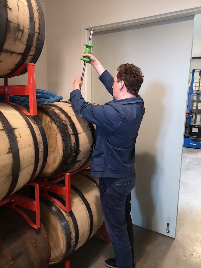 The barrel we got a sample from (#7) had been filled about 9 months ago and was a malt/grain single pot still blend. while still nosing fairly young and spirity, there was a ton of woody vanilla there from the virgin oak. The palate was a huge surprise for such a young spirit, with a ton of baking spices, toffee, vanilla, sweet caramel and wood spice. There was a hint of that young spirity character, but surprisingly little. Given a couple of years now in an ex-bourbon barrel, we felt this will develop into a delicious whisky with a ton of depth.