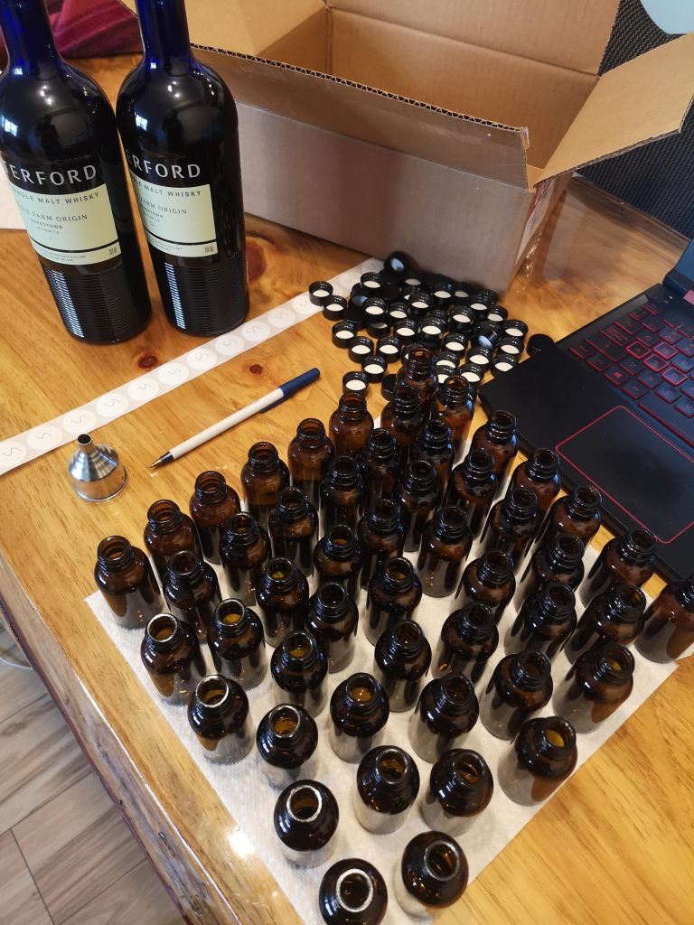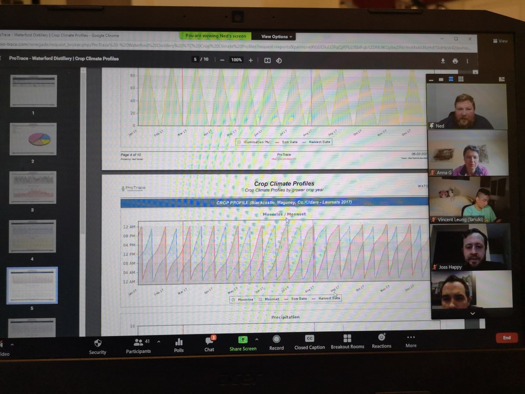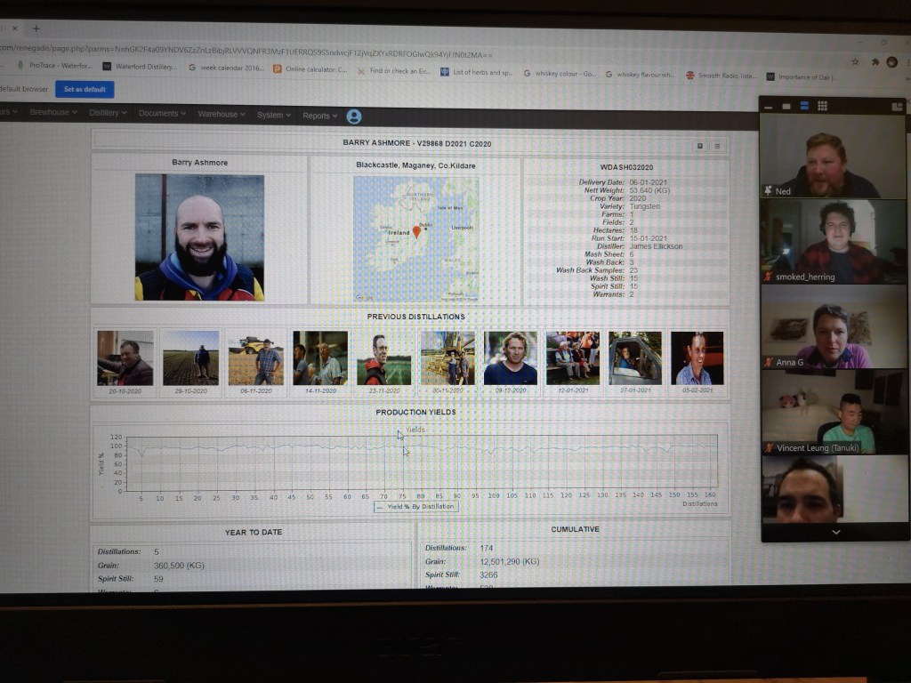In feb 2021 we held a tasting with Waterford Whiskey from Ireland, virtually connecting with the team at the distillery while tasting some of their wares. Waterford’s raison d’etre is to evaluate and demonstrate the effect of terroir on whiskey, much like with the wine industry. They closely monitor the climate and soil conditions at their various farms, creating single farm whiskeys and blends thereof. They use no enzymes, Laureate barley grain and very tight distillation cuts. Here are some pictures of the event, the amazing tracking dashboards they use for their experiments and some notes on the whiskeys we tried: