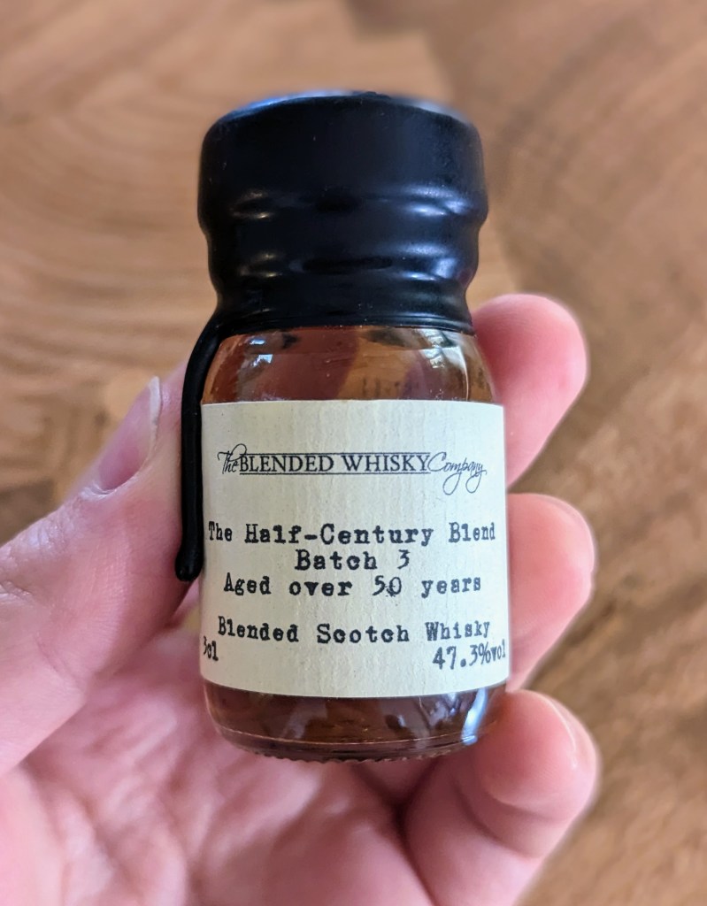 This is my first 50-year-old whisky, breaking my previous oldest-whisky record by a solid decade. It’s a blended scotch, bottled by the appropriately-named Blended Whisky Company in 2017. I couldn’t find any info on the composition of this blend, but no matter. Let’s give it a try!