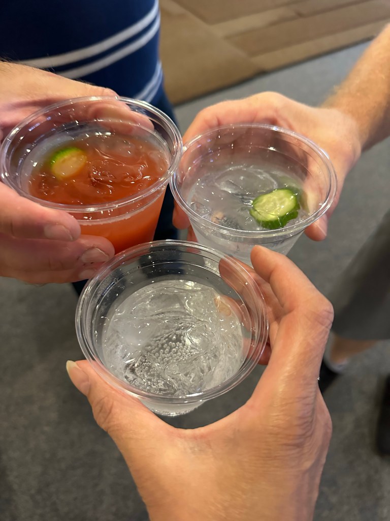 Members were greeted with Greek music and their choice of specialty cocktail. The welcome cocktails asked you, “where would you want to be right now”? Playing backgammon at a little taverna on the Plaka? Sitting on the seaside? Or at brunch in Santorini? Based on your answer, you were given a TNT (Tsipouro and Tonic), Bloody Diana orTsip and Seven. A vote was held and the winning cocktail was overwhelmingly the TNT. To compliment the mediterranean theme there were olives, feta and dates in addition to the usual pretzels, nuts and chocolates.