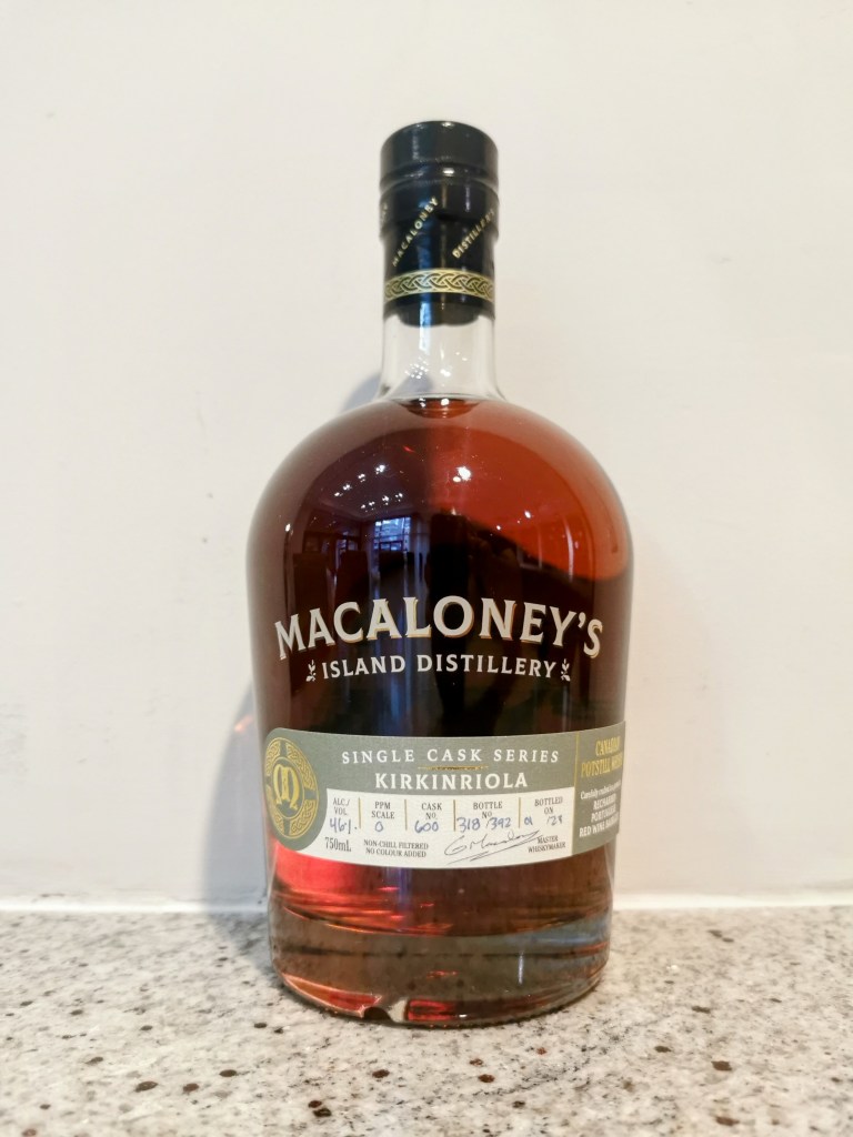 The Kirkinriola is a single cask release, aged in STR Portuguese port pipes. NCF and 46%.