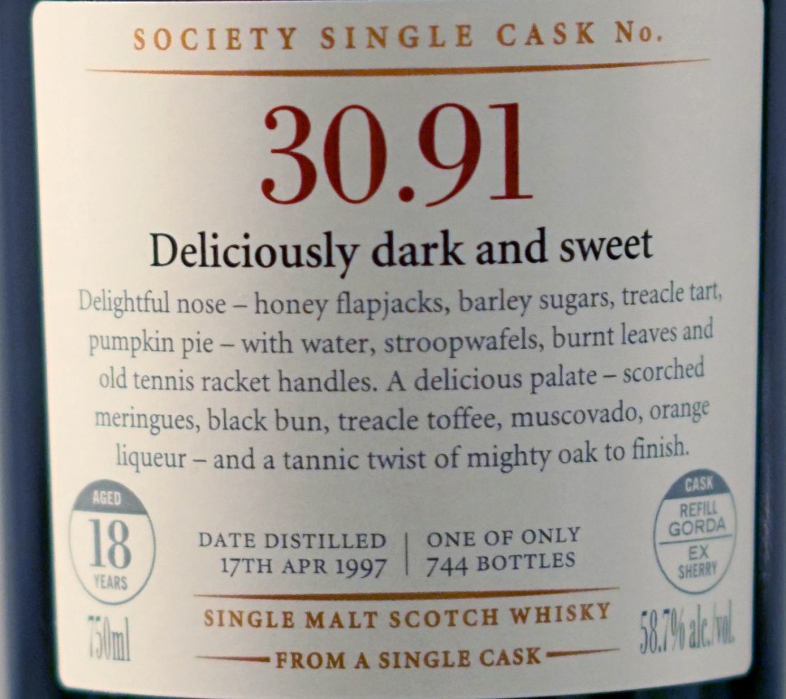 SMWS Code: 30.91 Code Name: “Deliciously dark and sweet” Distillery: Glenrothes Age: 18 years Cask: Refill Ex-Sherry Gorda Appearance: 1.1, Burnished Nose: Rum raisin ice cream, Christmas fruit cake, spent matches, ginger snaps, masala chai, plum pudding. What an odd nose. Am I detecting sulfur? For some reason, the sulfur is not overt here, or it’s blending weirdly with the other notes… Taste: Is this … Continue reading Review: Scotch Malt Whisky Society 30.91