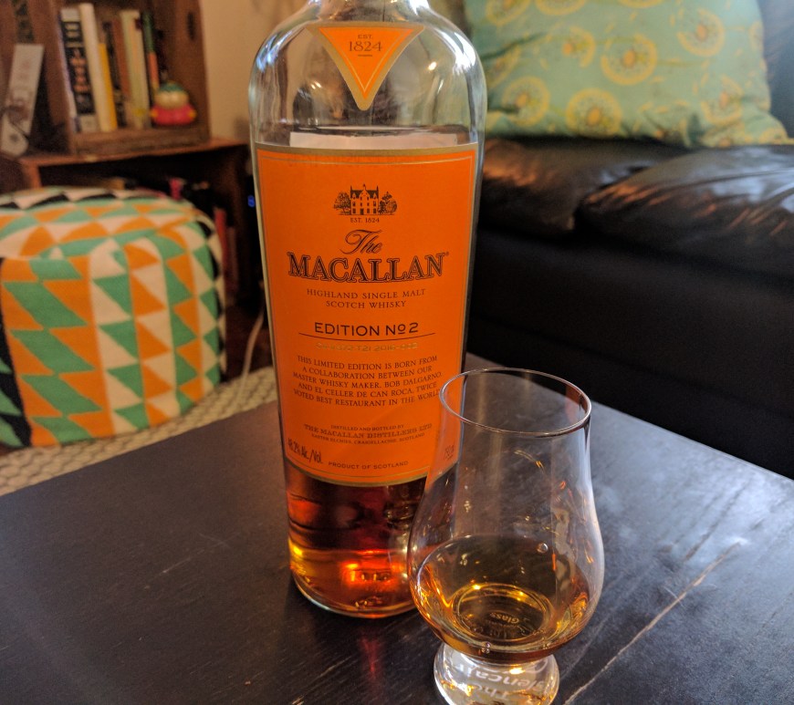 Macallan Edition No.2, 48.2% ABV, $117 USD Nose: Classic Macallan-like sherry, heavy on the dates and raisins. Chocolate, orange, and lemon peel. Ever have Mackintosh’s Toffee? (Came in that red tartan-style plaid box) I get flashbacks of that. Also typical Macallan oak tannins, and spice. Taste: Thick sherry and oak notes. Again, dates and raisins with more chocolate and orange peel. I get a faint … Continue reading Macallan Edition No.2